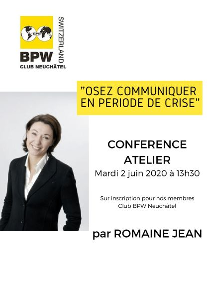 Votre club BPW Neuchâtel ne vous oublie pas et vous offre, en lieu et place des conférences programmées, une conférence-atelier en ligne qui vous donnera quelques clés et outils de communication vous permettant de surmonter cette période et d’anticiper l’après-Covid-19. Inscription réservée aux membres BPW Neuchâtel